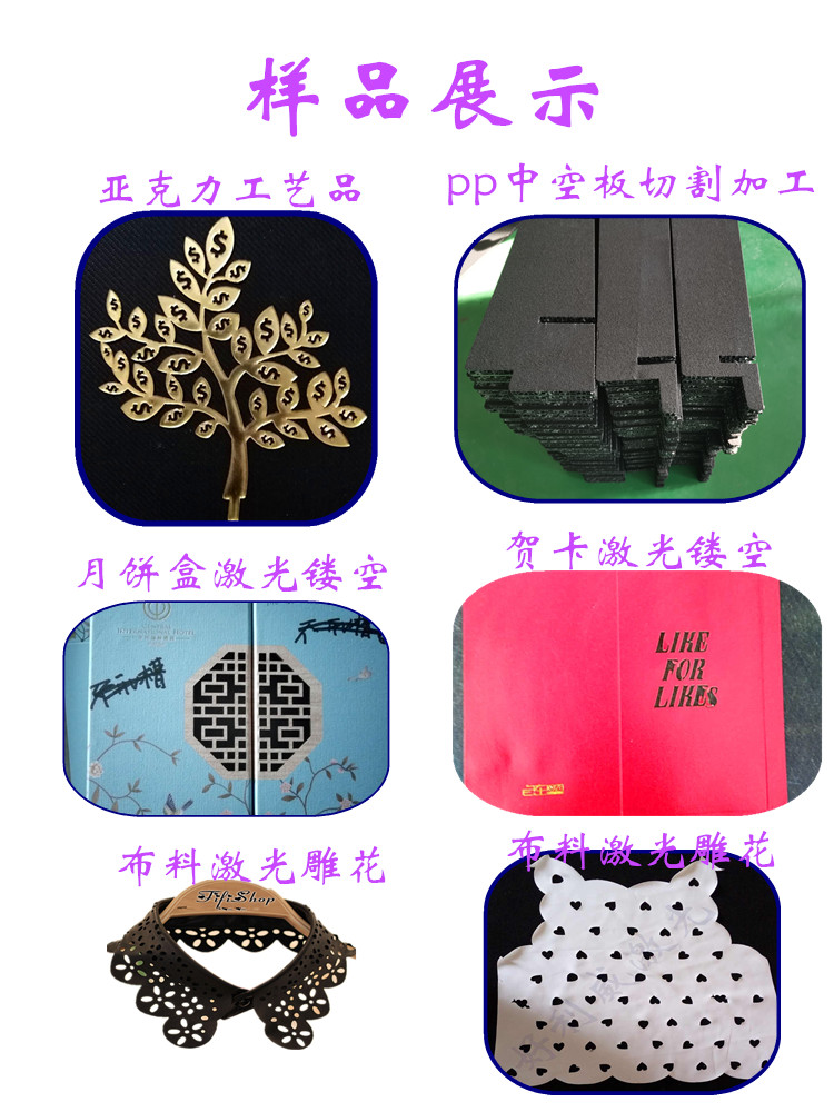本公司專業(yè)對(duì)外加工布料切割加工、無紡布毛氈激光鏤空 皮革激光加工、服裝布料激光雕花、麂皮絨激光切割、亞克力,竹木盒月餅盒激光加工,皮革激光雕花等。激光沖孔切割不發(fā)黑不發(fā)黃不發(fā)臭無黑灰”受到眾多客戶認(rèn)可歡迎打樣咨詢。